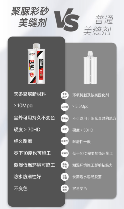 與環(huán)氧美縫相比,純聚脲美縫的粘結(jié)力更強。固化后堅硬無比、耐磨性強,防刮抗壓耐沖擊,不開裂脫落,使用壽命更長久。