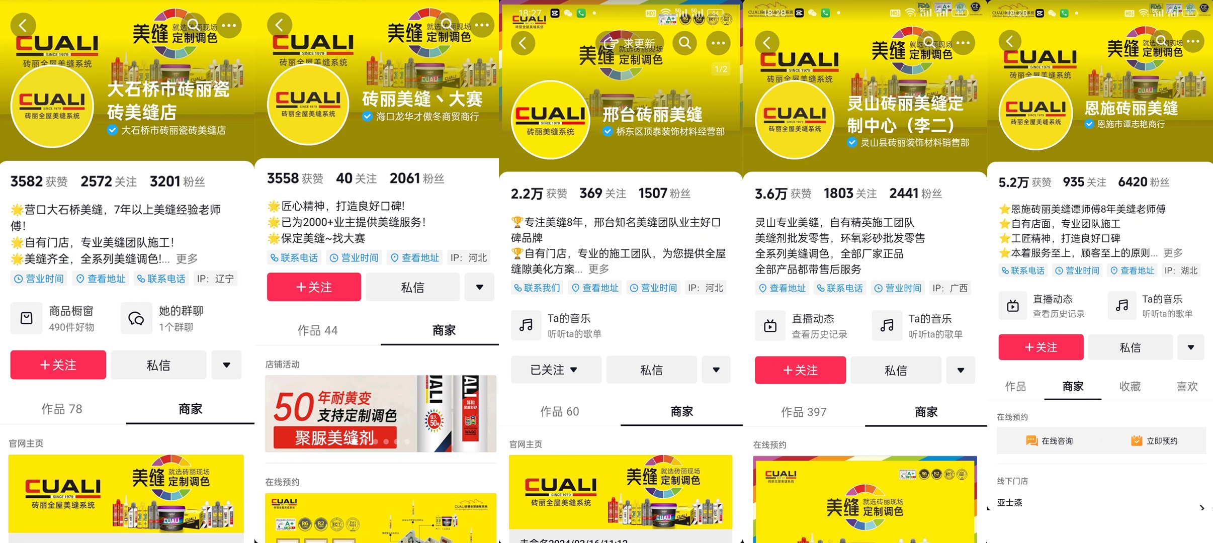 例如"磚麗美縫大賽”、“大石橋磚麗美縫”、“邢臺磚麗美縫”、“靈山磚麗美縫”等,以專業(yè)趣味的創(chuàng)作內(nèi)容,以及細致周到的美縫服務,贏得粉絲信賴,更有賬號獲得月400左右的留資,持續(xù)實現(xiàn)高效轉化。