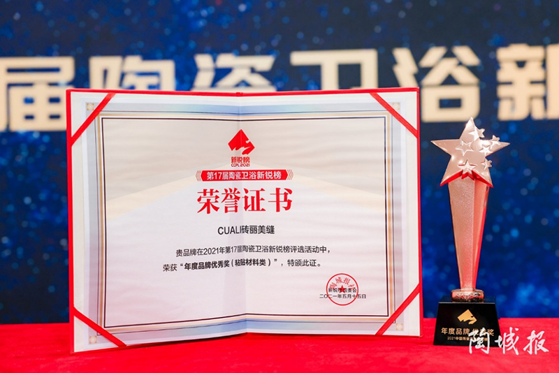 5月15日,2021年度中國(guó)陶瓷衛(wèi)浴新銳榜頒獎(jiǎng)盛典在佛山隆重舉行,盛典由行業(yè)知名媒體-陶城報(bào)承辦,由國(guó)家科技進(jìn)步獎(jiǎng)黃芯紅先生擔(dān)任評(píng)審委員會(huì)主席,聯(lián)合行業(yè)專(zhuān)家團(tuán)隊(duì)深入?yún)⒃u(píng)企業(yè)對(duì)數(shù)百款產(chǎn)品進(jìn)行考察,在激烈的競(jìng)爭(zhēng)中,CUALI磚麗美縫憑借過(guò)硬的產(chǎn)品質(zhì)量、良好的品牌信譽(yù)度等綜合實(shí)力被評(píng)為“2021年第17屆中國(guó)陶瓷衛(wèi)浴新銳榜(粘貼材料類(lèi))年度品牌優(yōu)秀獎(jiǎng)”。