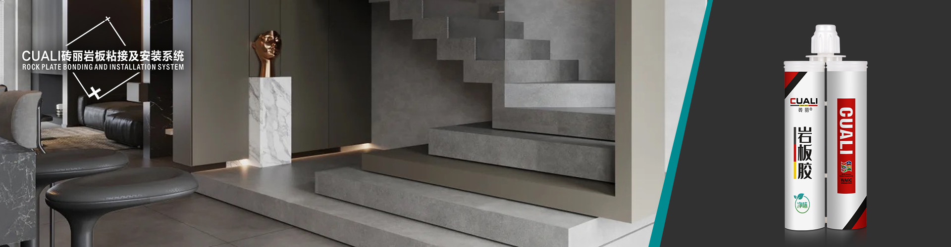 CUALI磚麗?巖板粘接膠采用環(huán)氧新材料創(chuàng)新精制而成,具有超強(qiáng)抗黃變及粘接力和好打磨、易施工等優(yōu)異性能。適用于巖板、大板、石材、人造石、陶瓷等制品(如:一體盆、浴室柜、家具等)的粘接、45度拼接、修補(bǔ)及陰、陽(yáng)角、邊角的美化等。